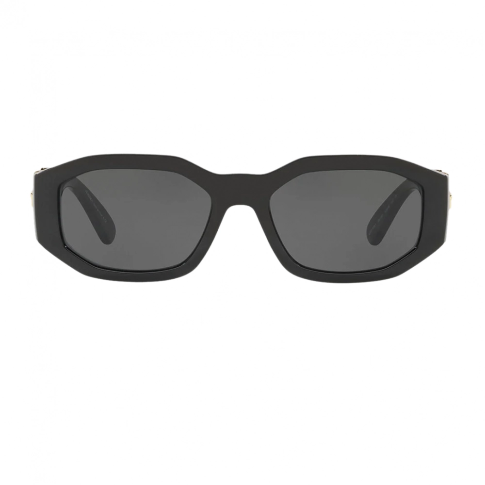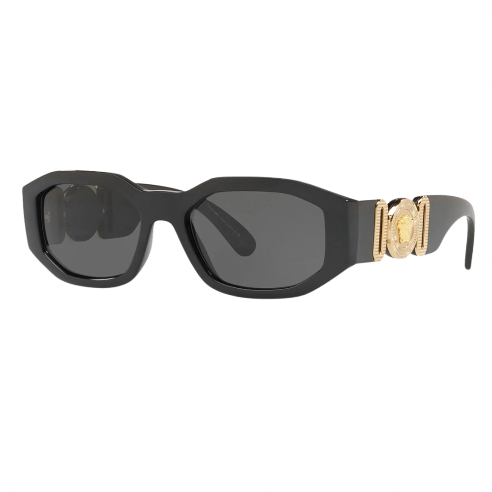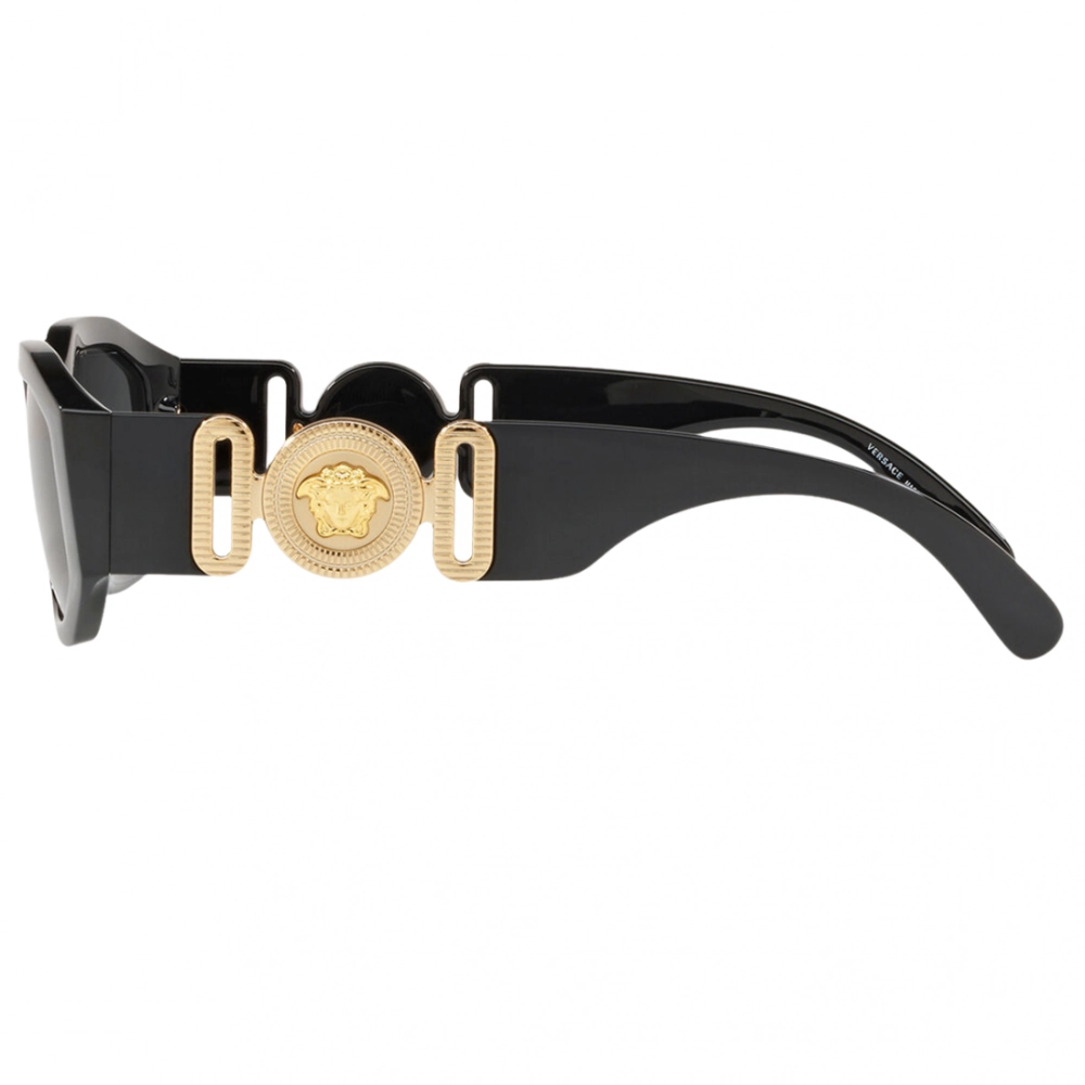 Óculos de sol que evocam o estilo opulento de um ícone do hip-hop com um formato ousado de lente baixa e hastes largas embelezadas por um medalhão de Medusa Biggie em tom dourado. Em uma combinação clássica de uma armação preta grossa e lentes cinza.